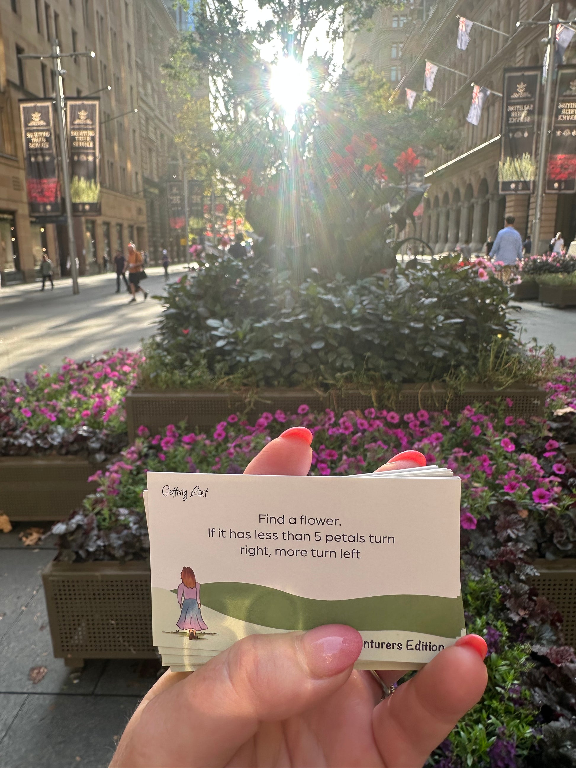 These cards will have you exploring a course that is as unique as you are. Your direction will be decided by the petals on flowers, bugs, colours, sounds, pages in a book and what others around you are doing. Your activities will be decided by your five year old self, your favourite colour, your food tastes, what brings you joy and some other chance happenings.